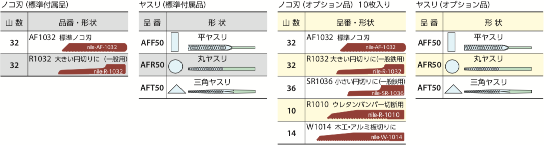 標準付屬品:専用ノコ刃2枚(1枚はノコ刃ホルダー付、もう1枚はノコ刃のみ)